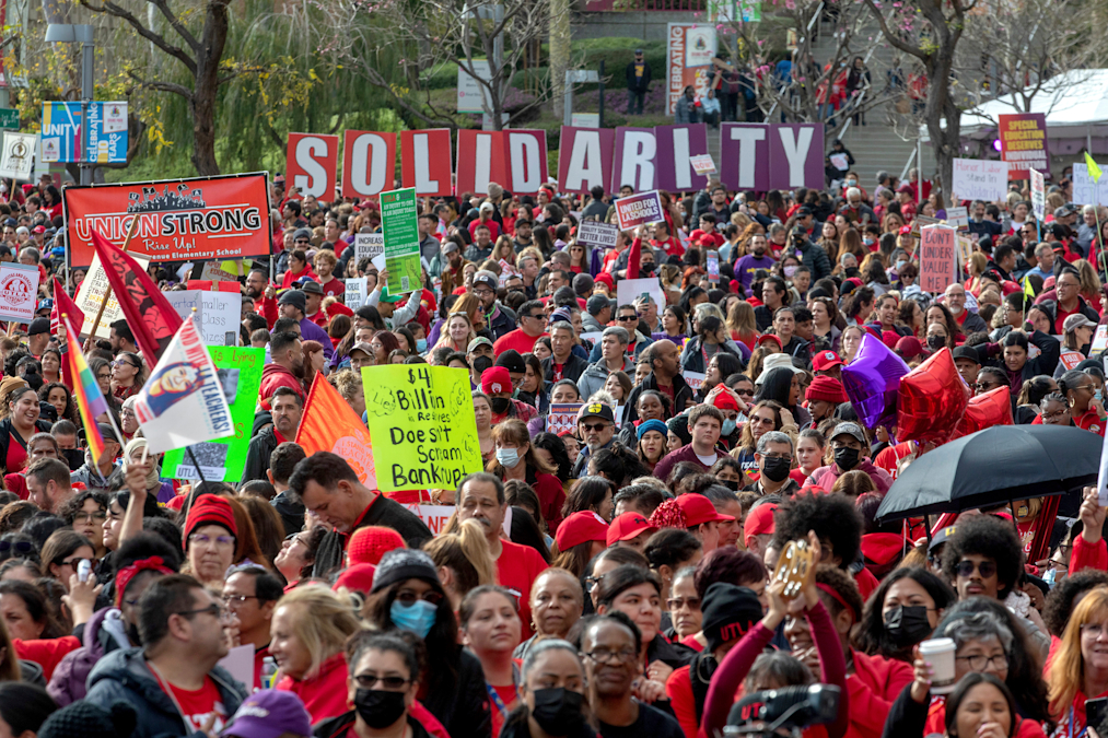 Tens of thousands of workers in the Los Angeles Unified School District walked off the job Tuesday over stalled contract talks, and they are being joined in solidarity by teachers in a three-day strike that has shut down the nation’s second-largest school system.